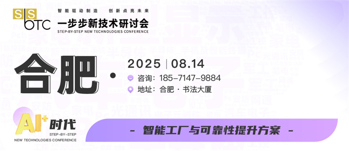 2025 年 8 月 14 日,一步步新技術(shù)研討會將走進合肥,在合肥書法大廈以《AI + 時代智能工廠與可靠性提升方案》為主題舉辦研討會。研討會將面向長江中游城市群的電子制造業(yè)觀眾,致力于推動安徽省電子制造產(chǎn)業(yè)發(fā)展,凝聚國內(nèi)外一流的智能制造資源,促進交流、建立與國際接軌的智能制造產(chǎn)業(yè)服務(wù)平臺,為合肥智造的進一步升級賦能,助力合肥在智能制造領(lǐng)域?qū)崿F(xiàn)更高質(zhì)量的發(fā)展,誠邀您蒞臨參會。
